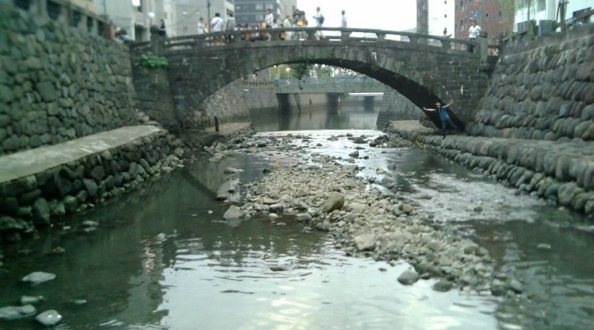 長崎の橋がいっぱいある河辺、よく見るとおできとりゅーたが見えます